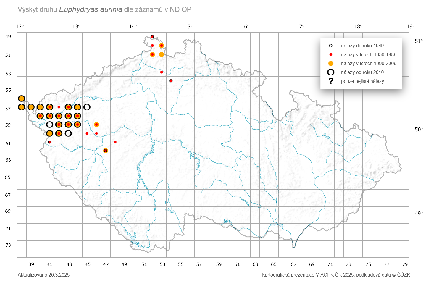 Mapa 1: Výskyt hnědáska chrastavcového v České republice. Data z roku 2025.